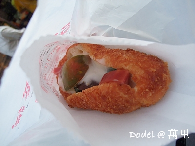可是說真的,還真得滿好吃的啦!外麵的麵包炸的酥脆好吃,裡頭美乃滋混著皮蛋、火腿、小黃瓜、番茄,很清爽。而且分量不大卻很有飽足感,大概是油炸的關係吧!在我胃裡膨脹了~