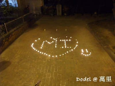 剛好有情侶在表白,用蠟燭排成了愛心跟名字吧!好浪漫喔!